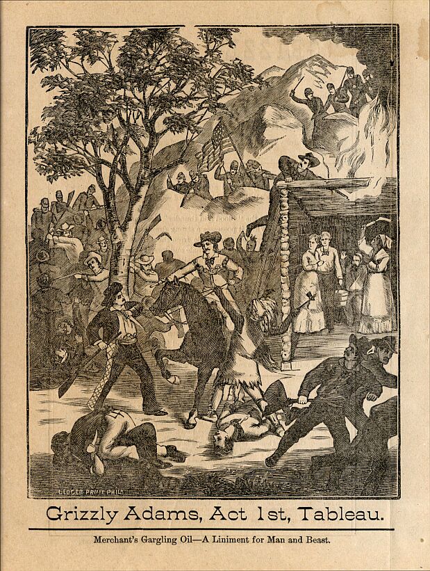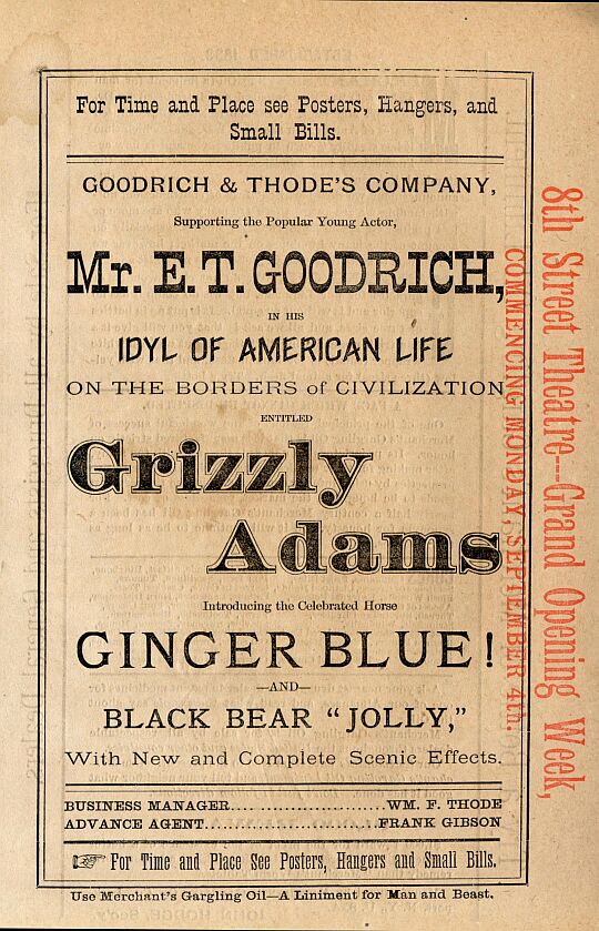 The front of a playbill for Grizzly Adams. A pencil notation dates it from 1879.