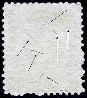 A Brief Look at Paper Types ![]() "Old" paper is anything that the first issue of documentary and proprietary stamps were printed on. There are varieties, and the best distinction between it and the later, watermarked paper is the absence of the watermark. ![]() Some of the old paper has small, intermittent bits of silk in it. This "experimental silk" paper is also found on first issue revenue stamps. Any stamp on experimental silk paper will not have a watermark. ![]() ![]() Silk paper was used for the second and third general issues of revenue stamps. This paper is characterized by the presence of numerous silk threads. ![]() The reason for the use of pink paper is not known. The Boston Book says that it was only used by the National Bank Note Company in late 1877 - early 1878. Watermarked paper had been delivered by then, so this was not done to bridge the deliveries between the silk paper and that. ![]() The white paper used in and after late 1877 contains a double-line USIR watermark. Return |