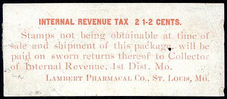 Provisional Stamps "It took Congress about six weeks to pass the bill known as the 'U.S. Revenue War Bill of 1898' which was entitled 'An Act to Provide Ways and Means to Meet War Expenditures and for Other Purposes,' effective July 1, 1898. One provision of the new law required that all proprietary medicines be taxed and a stamp affixed to each box or bottle as evidence the tax had been paid. "Meanwhile the Bureau of Engraving and Printing in Washington had anticipated the emergency and begun work on the dies, rolls, plates, etc., from which were to come the "Battleship" Documentary and Proprietary revenue stamps. However, it was very soon evident the stamps could not be printed and distributed by the effective date. Even provisional overprints of the postage stamps then current would not suffice to bridge the gap. "In their dilemma eight medicine manufacturers doing business in St. Louis turned to the local Collector of Internal Revenue. He evidently succeeded in having the Department authorize stickers to be used in lieu of stamps during the early part of July, 1898...." In the Morton Dean Joyce sale, June 4-5, 1991, provisional stamps of nine St. Louis companies were listed, plus one from Macon, Georgia. The Scott Specialized now lists these, with ten Saint Louis companies represented, plus the one from Macon. Almost all of these stamps can be seen here, courtesy of Hermann Ivester: Saint Louis Provisional Proprietary Stamps. ![]() One of the denominations of the stamps used by Antikamnia, with a first day cancel. ![]() The Lambert Pharmacal Company was another of the companies with authorized provisional stamps. ![]() Jno. T. Milliken & Company used two denominations of provisional stamps. You can find the provisional stamps of all of the currently known users here. Return |