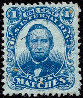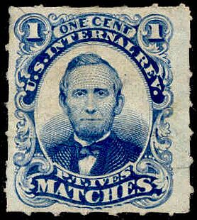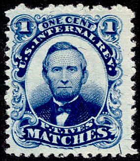 In 1867 the Ives Company began to use private die one-cent stamps. For some reason the design just said "Ives Matches," even though the eight-cent stamps had "P.T. Ives" on them. These stamps were issued from June 10, 1867 to August of 1875. 5,789,890 were printed on old paper and 4,256,910 on silk paper. This copy is on silk paper.