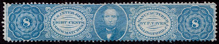 The Ives match factory was located in Wallingford, Connecticut, very near a number of other match manufacturers. The first private die stamps issued for the company bore an eight cent denomination, good for double packages of 400 stamps. The reference they bear to Coe's Matches is unexplained. They were issued from March of 1865 until January 24, 1871. 860,400 were issued on old paper.
