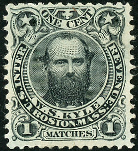 The Kyle factory was in Norton, Massachusetts. Kyle only ran it for a short time after his private die stamps were issued in March of 1865, as they were delivered to Austin Messinger after March of 1866. Stamps with the Kyle name continued to be delivered until August, 1875. 17,076,000 were printed on old paper and 21,155,609 on silk paper. The one above is on old paper.