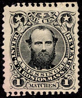 In 1875 Messinger had the die altered to show his name. He continued to operate the factory even after Diamond Match bought it, around 1881. The stamps were delivered up through May 15, 1883. 54,578,510 were issued on silk, pink and watermarked papers. The one shown here is on watermarked paper.