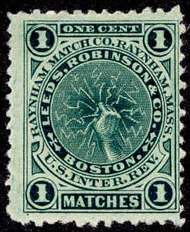 Leeds, Robinson & Company were the agents for the Raynham Match Company. The match company was not in business long. Only one delivery of stamps, 231,000 printed on watermarked paper, was made, on March 10, 1883. The catalog listing is under the name of the agents.