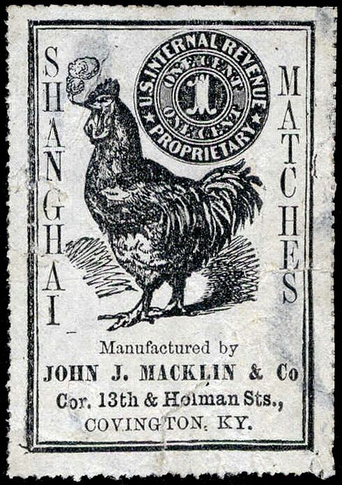 The Macklin match stamps are large, crudely printed items, reputedly done by American Phototype rather than the approved printers. John Macklin owned several match companies at the time, 1881-3, apparently none of which were in Covington. One was in Atlanta, using stamps of the Maryland Match Company. Another was located in Lyons, Iowa. Macklin's son, interviewed in the early part of the 20th Century, recalled that some quantities of matches were brought from Baltimore to Covington to have the heads re-dipped. This would account for the location printed on the stamps.
