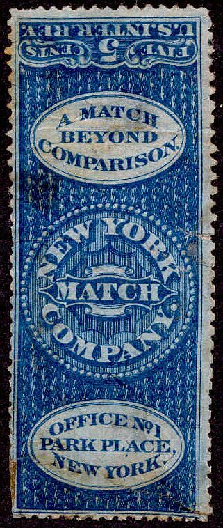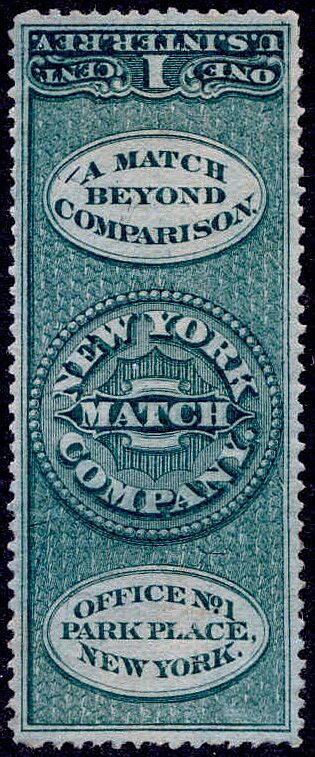 The New York Match Company was the successor to B. & H.D. Howard. It also bought out Bauer & Beudel. For some time in 1871 and 1872 the company was using four different one-cent stamps on its products: The Bauer & Beudel stamp, the one based on that stamp but with the name of the New York Match Co., the vermilion one based on the Howard stamp, and the tall green one pictured above.