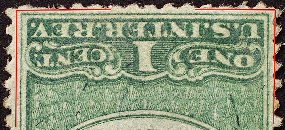 A double transfer is known on the one cent stamp, consisting of faint extra frame lines on the inside at upper left, above the top, and on the outside of the upper frame at right.