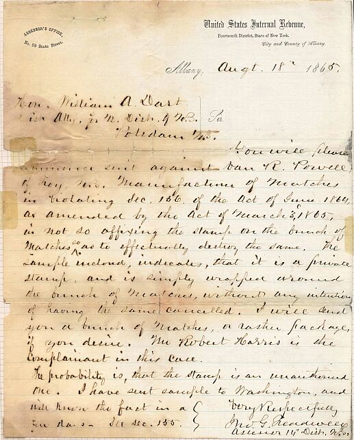 Even though the Powell wrappers were approved by the Commissioner of Internal Revenue, shortly after their issue Powell was sued concerning the way they were used. This is the actual letter from Jno. G. Treadwell, Assessor 14th District, N.Y. "You will please commence suit against Van R. Powell of Troy, N.Y., manufacturer of matches... in not so affixing the stamp on the bunch of matches so as to effectually destroy the same. ... The probability is that the stamp is an unauthorized one....." On the back of the letter is written, "U.S. v. Van R. Powell - Suspended by order of court."