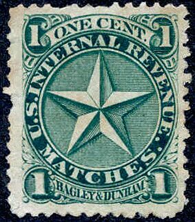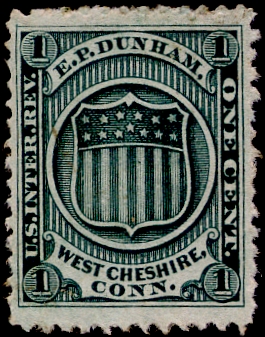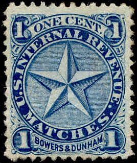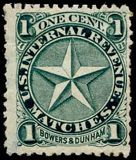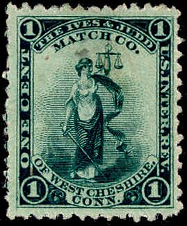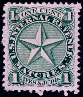 There was some sort of dispute connected with the sale of the Dunham Company to Diamond Match, with the result that Dunham again took control of the factory. The firm reverted to the name of Ives & Judd (the widow of Howard Ives was Dunham's sister, and active in the company.) Their stamps were issued beginning in November 10, 1882 and continued untl March 3, 1883, giving them enough to use until the tax was lifted on July 1, 1883. 2,625,000 were printed, on watermarked paper.