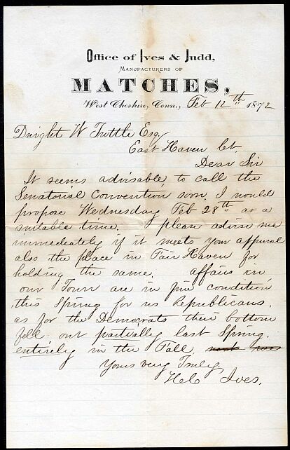 A political letter with an Ives & Judd letterhead. It appears to be signed by Howard Ives, Postmaster of West Cheshire.