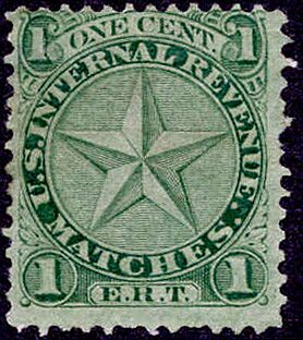 There were a number of changes in the design of the stamps used by the match factory located in Rag Hollow, Connecticut. The earliest stamp is that of E. R. Tyler, first issued in September of 1866. The stamps were used by the firm that bought the company from Tyler as well, until August of 1875. 12,613,020 were issued on old paper, and 14,709,000 on silk paper. The copy shown is on old paper.