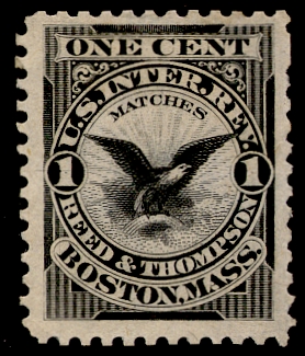 The Boston Eagle Match Company was run by Edmund Reed and John C. Thompson for about three years, then it vanished. The company's stamps were issued from February of 1878 until January 20, 1881, about the time that Diamond Match took over Byam & Carlton. 3,910,615 were printed on old paper.