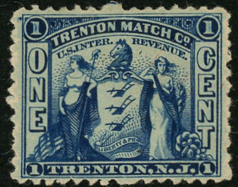 Trenton Match may have been running as early as 1869, but its stamps were only produced from April of 1881 until the end of February, 1883. 7,770,000 were printed on watermarked paper.