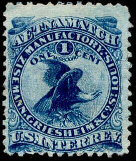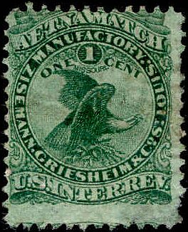 In 1875, when the National Bank Note Company took over printing proprietary stamps from the Carpenter firm, F. Mansfield and Company had a new plate made with their name substituted for Zisemann, Griesheim. Their stamps were printed from November of 1875 through November of 1879. 2,200,000 were issued on silk, pink and watermarked papers. The stamp above was printed on watermarked paper.