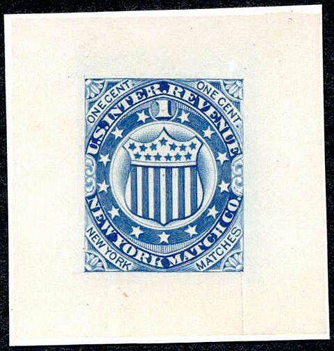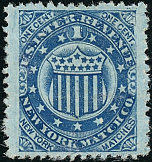 The New York Match Company bought out Bauer & Beudel in January of 1871 and had their own stamp printed in April of that year. However, they kept using the Bauer & Baudel stamps well into 1872. Their own stamps were printed through August, 1875. 1,026,270 were issued on old paper, and 22,780,410 on silk paper. This example is printed on silk paper.