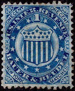 The firm of Bauer & Beudel operated in New York City in the late 1860's. Their stamps were issued from October of 1868 until June, 1872, even though they sold the business in January of 1871. 5,452,710 were issued on old paper, and 1,009,100 on silk paper. The copy shown is on silk paper.