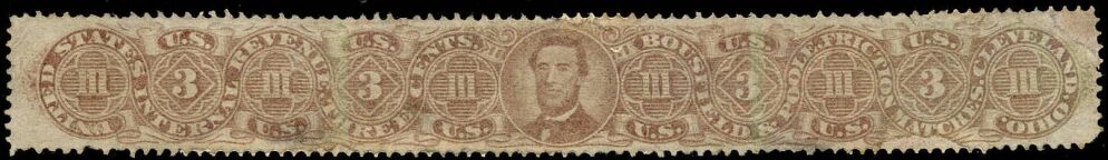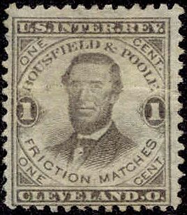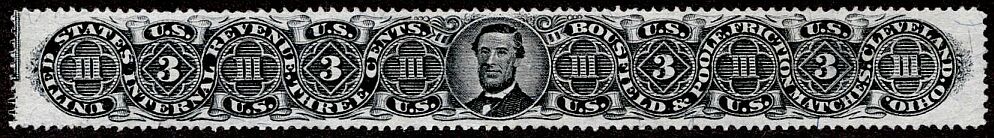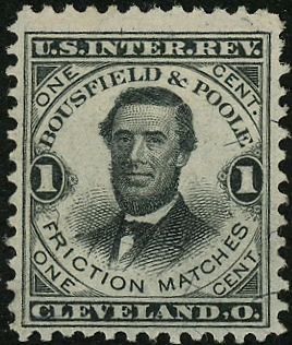 Bousfield & Poole also issued stamps to pay the tax on packs of 75 matches. 83,600 were issued in purple on old paper in August through September of 1867. Black was used thereafter, with 7,019,192 issued on old paper and 6,104,789 on silk paper, until the end of October, 1876. The example above, shown at about 60% of the size of the one-cent illustrations, is of a copy printed on silk paper.