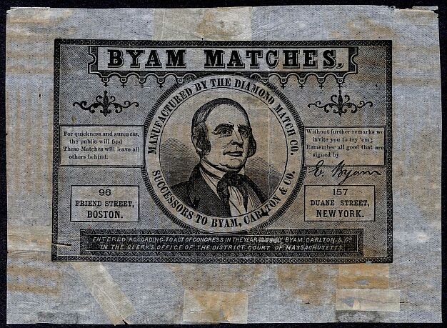 Byam & Carlton had been bought out by the Diamond Match Company by 1881. This wrapper could have been used after the tax ended in 1883, or with an adhesive stamp to pay the tax, if earlier. "For quickness and sureness, the public will find/ These Matches will leave all others behind./ Without further remarks we invite you to try 'em;/ Remember all good that are signed by E. Byam."