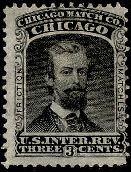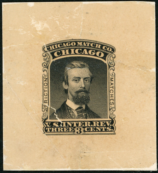 The Chicago Match Company was a short-lived venture. The owners were furniture manufacturers, and did not spend much time in the match business. Their stamps were issued from November of 1865 to mid-July, 1866. 292,666 were issued on old paper. Most are poorly centered.