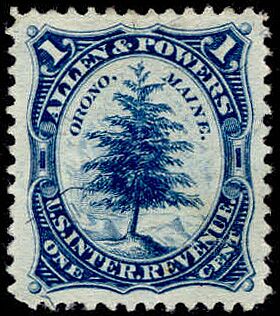 Allen & Powers was the successor organization to Orono Match Company. The stamp design is the same except for the different manufacturer's name. The stamps were issued between February of 1876 and October, 1882. 6,401,510 were issued on silk, pink and watermarked paper. This stamp is on silk paper.