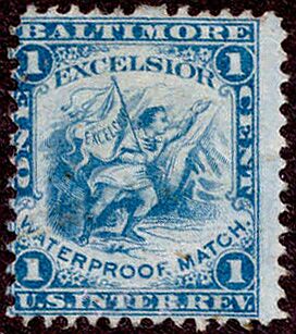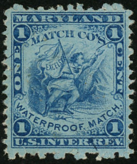 In 1872 Lord & Robinson sold Excelsior to Weedon & Bell, who changed the name to the Maryland Match Company. The stamp die was altered accordingly, and stamps were issued from September, 1872 through August, 1874. 9,075,000 were issued on silk paper.