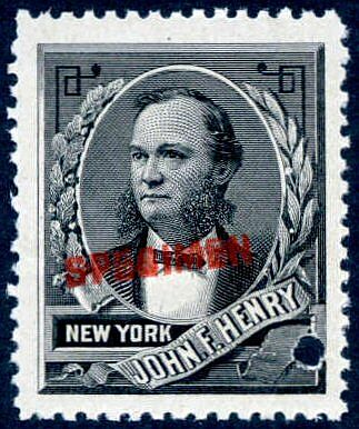 John F. Henry was one of the sons in J.M. Henry & Sons, a proprietary medicine firm operating in the 1850's in Vermont. In 1865 John F. went to New York to work for Demas Barnes. Barnes wanted to run for Congress and pursue other activities, so in 1868 Henry took over as successor. By 1869 Henry must have run out of proprietary stamps from Barnes, so he ordered his own in one, two and four-cent denominations.