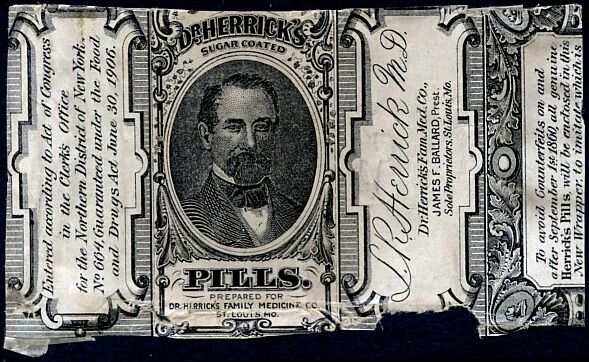 William Henry Hall, of Hall & Ruckel, became connected with the business around 1874. When W.L. Warner and company was dissolved around 1898 Augustus H. Hall helped reconstitute the company. It was sold and moved to Saint Louis in 1907. This wrapper for Herrick's Pills is from the Saint Louis period, when James F. Ballard was proprietor.