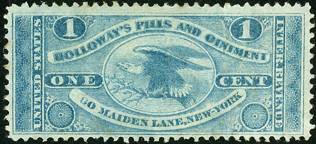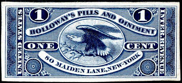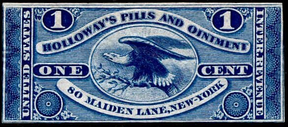 Thomas Holloway was based in England. Holloway's Pills and Ointment were introduced in the States in the 1850's. A private die stamp was ordered early in the tax period and first issued in April of 1863. In the early 1870's the company may have withdrawn from the American market, and the stamps were last delivered in September of 1870. When sale of the products was resumed in the US in 1879 general issue stamps were used.