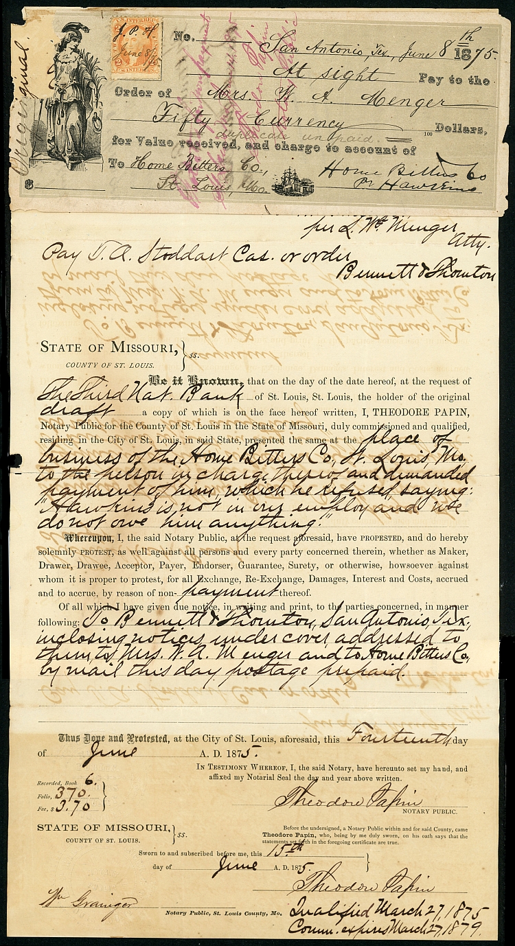 It appears that someone in Texas was passing himself off as a representative of the Home Bitters Company and writing merchant's drafts on the company to obtain money. When this one came back to the company to be approved they denied it, which led to a protest filed in 1875.