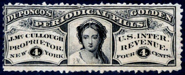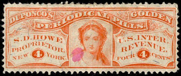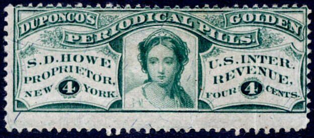 Although Stewart (or Stuart) D. Howe acquired Duponco's Golden Periodical Pills in 1866 and had a design approved for issue that year, it was not until February of 1870 that the first of his private die stamps were issued. These were printed until Howe sold the product to Kidder, Wetherill & Company in 1873. The final delivery of stamps with Howe's name was March 25 of that year. 53,727 were issued on old paper and 30, 415 on silk paper. The copy shown is on old paper.