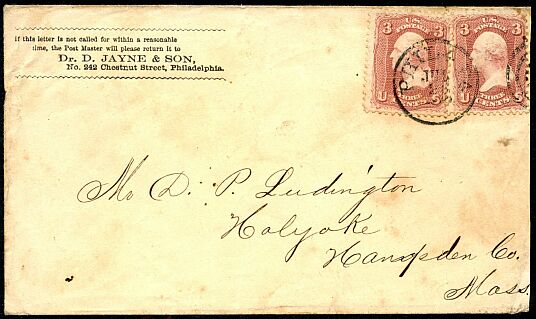 An 1855 receipt from the Jane Company. It was used very shortly after the company became Dr. Jayne & Son, and while a notice of the change was printed in the top margin, the text of the receipt still used singular pronouns, which were all changed by manuscript.