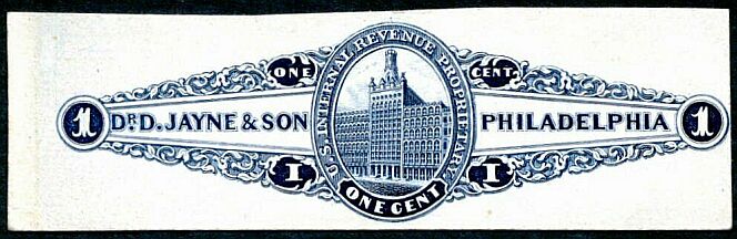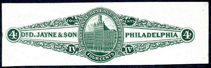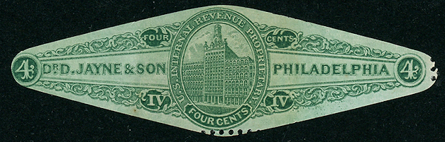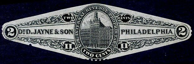 The Jayne firm did not have a private die stamp designed for their use during the Spanish American War tax period. Their cancels can be found on "battleship" proprietaries of the period.