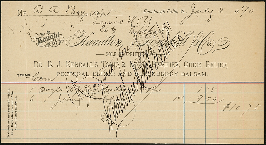 A Kendall receipt for Pectoral Elixir and Blackberry Balsam, 1890.