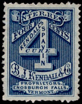 Kendall's four-cent private proprietary stamp was issued from September 17, 1881 until February 15, 1883. 374,000 were printed, all on old paper.