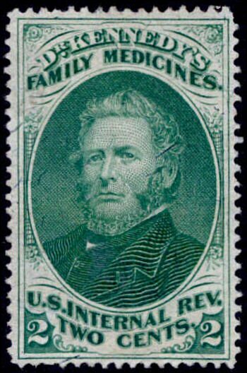 Kennedy's two-cent green stamp was issued first, from 1870 until February 21, 1883. 275,625 were printed on old paper, 511,699 on silk paper and 706,062 on pink and watermarked papers. The copy shown is printed on silk paper.