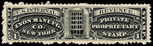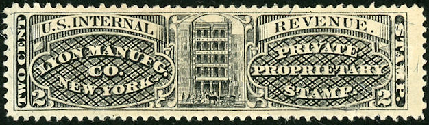 Demas Barnes and John D. Park formed the Lyon Manufacturing Company in 1871 to sell medicines then being handled by P.H. Drake & Company, but possibly not Cabin Bitters. The unused one-cent Demas Barnes die was turned over to Lyon with the two-cent Drake die, and both were altered.