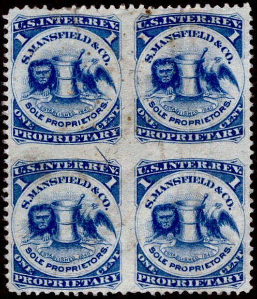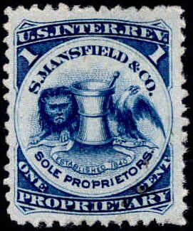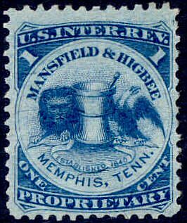 Samuel Mansfield began as an apothecary in Memphis, Tennessee, in 1840. Around 1870 he entered into partnership with Hugh H. Higbee to act as agents for and to manufacture proprietary medicines. These included Mansfield's Hungarian Balsam for the Lungs, Mansfield's Eclectic Pile Salve and Mansfield's Mississippi Diarrohea Cordial, among others. The company ordered a private die stamp, and instructed Joseph R. Carpenter to perforate some in sets of four and some in pairs in addition to regular full perforation.