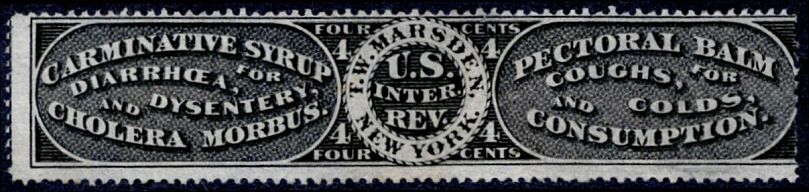 Thomas W. Marsden was the manufacturer of Marsden's Pectoral Balm for coughts, colds and consumption, and Marsden's Carminative Syrup for diarrhoea, dysentery and cholera. His black, four-cent private proprietary stamp was issued only once, on August 20, 1866. 27,500 copies were printed, on old paper.