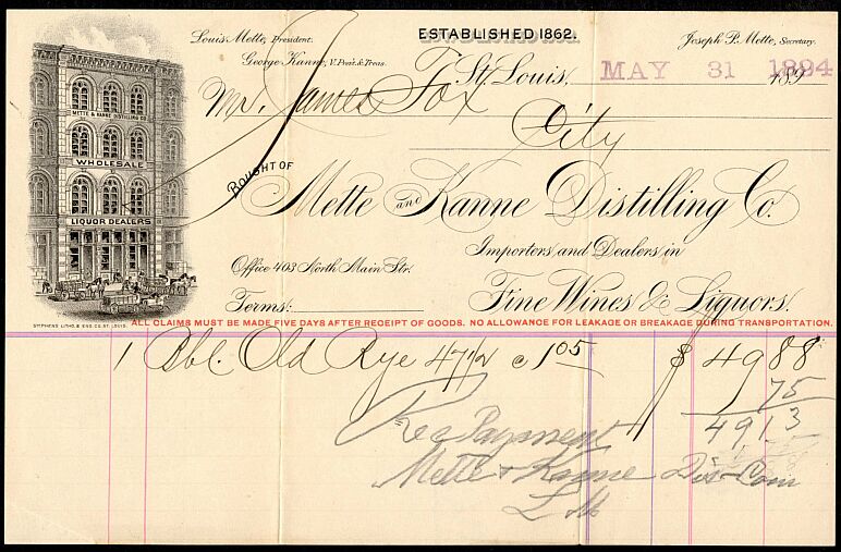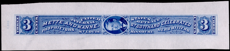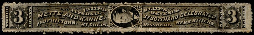 Louis Mette and George Kanne were liquor dealers in Saint Louis. There is nothing to indicate they ever were engaged in the proprietary medicine business other than their private die stamp. This was issued from 1879 until October 12, 1882. 131,400 were printed, all on watermarked paper.
