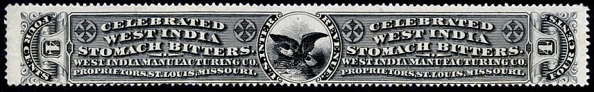Yet another Saint Louis company that seemed to have no connection to medicine had a private die printed for that purpose. Matthew Moody, Joshua C. Michel and Morey T. Andrews were listed in the 1867 City Directory as "wholesale grocers, wines, liquors, cigars." Nevertheless, they had a stamp issued for use on their Celebrated West India Stomach Bitters from July of 1863 until May of 1867. 42,875 were printed, all on old paper.