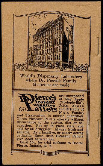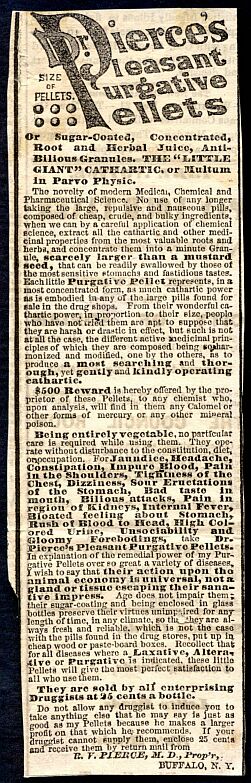 Ray Vaughn Pierce could trace his ancestry to one Abraham Pierce who came to the Colonies in 1623. R.V. received medical training and not only set up practice but also developed a stable of proprietary medicines, including Dr. Pierce's Golden Medical Discovery for cure of bronchitis and consumption, Dr. Pierce's Commpound Extract of Smart-Weed or Water Pepper for the bowels, compounded of several herbs and the Best French Brandy, and Dr. Pierce's Pleasant Purgative Pellets, the use of which is obvious.