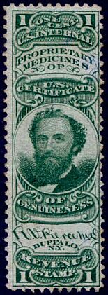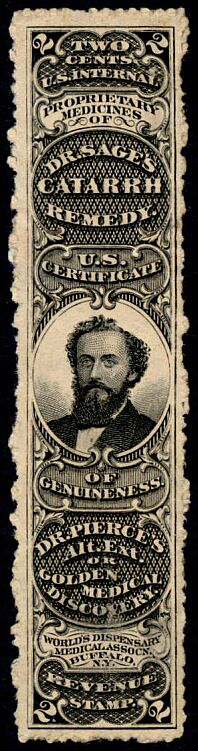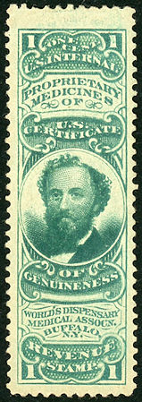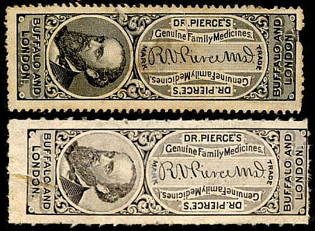After the end of the proprietary medicine tax on June 30, 1883 Pierce used facsimile stamps on the products. These are known with perforations and rouletting.