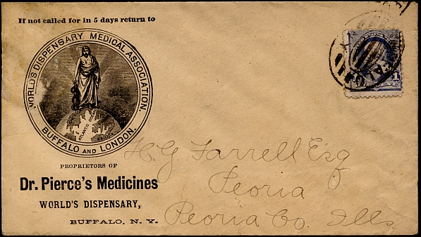 Dr. Pierce's first private die stamp was the two-cent black, issued from April of 1870 until February of 1879. 699,624 were printed on old paper, 3,868,624 on silk paper and 2,061,192 on pink and watermarked papers. This one is on watermarked paper.