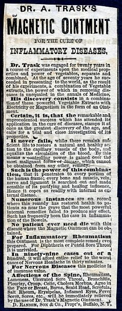 Doctor David Ransom began his practice in Buffalo, New York in 1846. He produced Dr. D. Ransom's King of the Blood, claiming to cure cancers and cancerous tumors "without the surgeon's knife," as well as scrofula and consumption! Then there was Dr. A. Trask's Magnetic Ointment for croup, sore throat, diphtheria and rheumatism. Other magnetic balms and Indian balm pills followed.