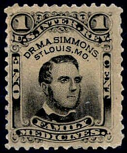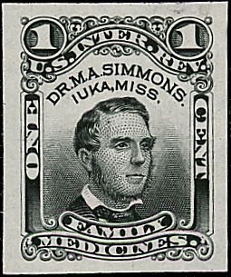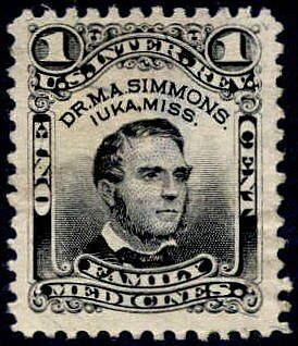 Doctor M.A. Simmons first practiced medicine in Georgia, where he brewed up Simmons Liver Medicine (curing costiveness, lowness of spirits, colic, foul breath, dyspepsia, etc.) and drove through the countryside with a five-gallon keg of it, dispensing however much anyone wanted to buy. He moved to Mississippi, first living in Holly Springs, but located in Iuka when the proprietary medicine tax became effective in 1862. His private die stamp was not issued until December of 1875. It was last delivered in December of 1879. 356,683 were printed on silk and watermarked papers, mostly on silk paper. The copy above is on silk paper.