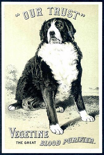 "Major is the name of this pure blood Newfoundland dog, owned by the proprietor of Vegetine. Major is six years old, weighs 125 pounds; is very intelligent, sagacious and faithful; a good watch-dog, and a great pet among children. This picture was lithographed from an oil painting taken from life. Major is called the handsomest dog in New England."