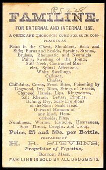 Vegetine, "an Indian Remedy," was developed in 1851 by a Dr. Cummings who lived in the Boston area. At that time Henry R. Stevens was in the shipping business in Boston. By 1871 Stevens was the sole proprietor of Vegetine.