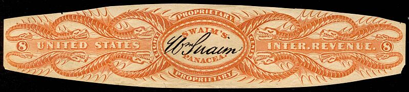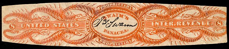 After the proprietary taxes were repealed William Swaim had a facsimile stamp prepared to preserve the distinctive look of his packaging.