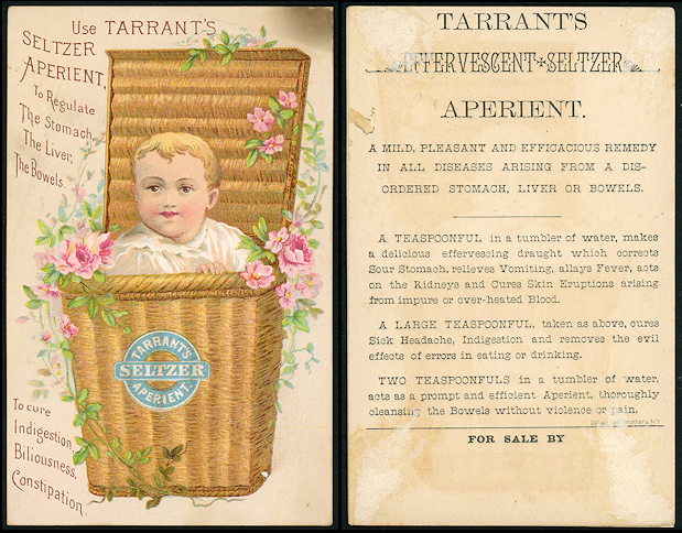 A trade card advertising Tarrant's Seltzer Aperient, which is claimed to cure indigestion, biliousness and constipation.
