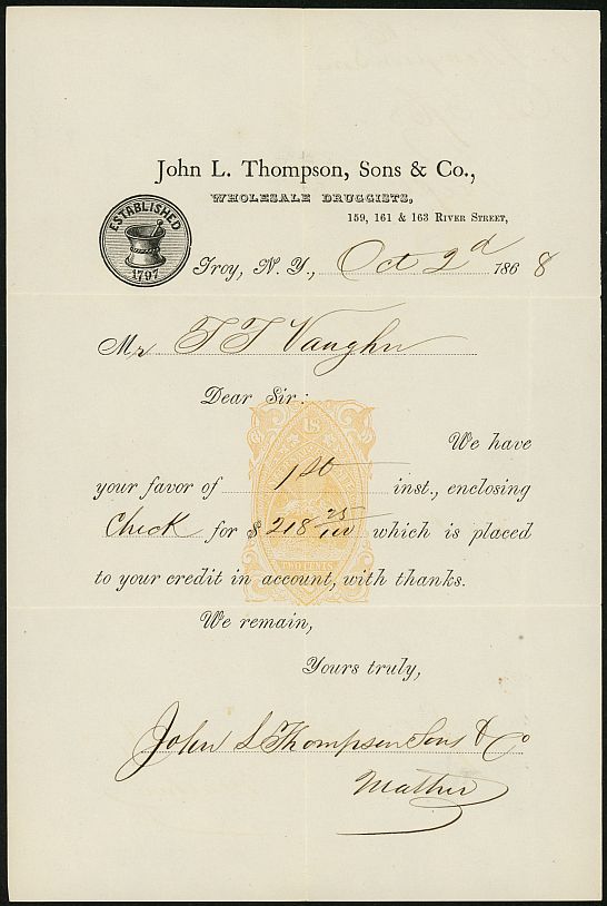 An 1868 receipt from John L. Thompson, Wholesale Druggists.